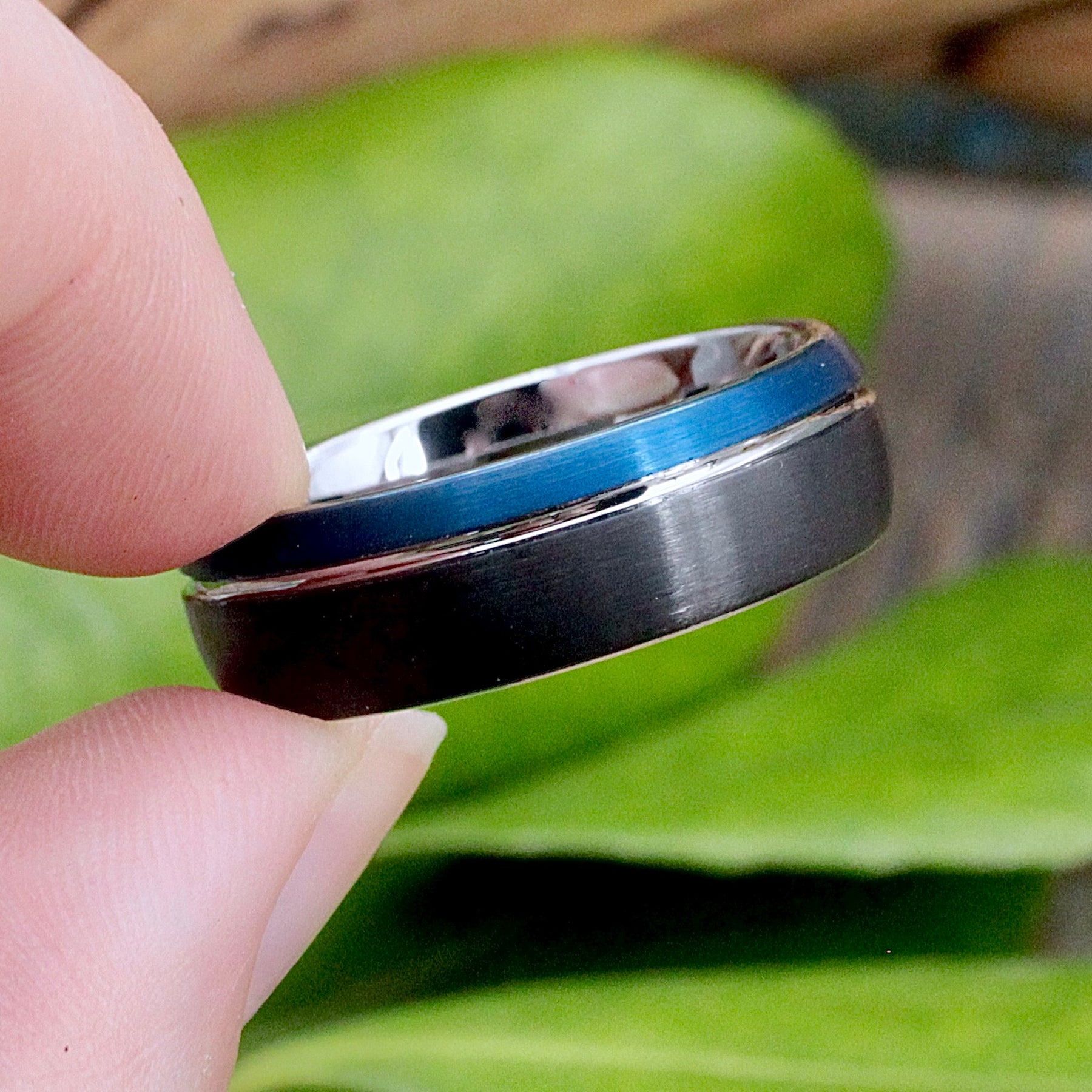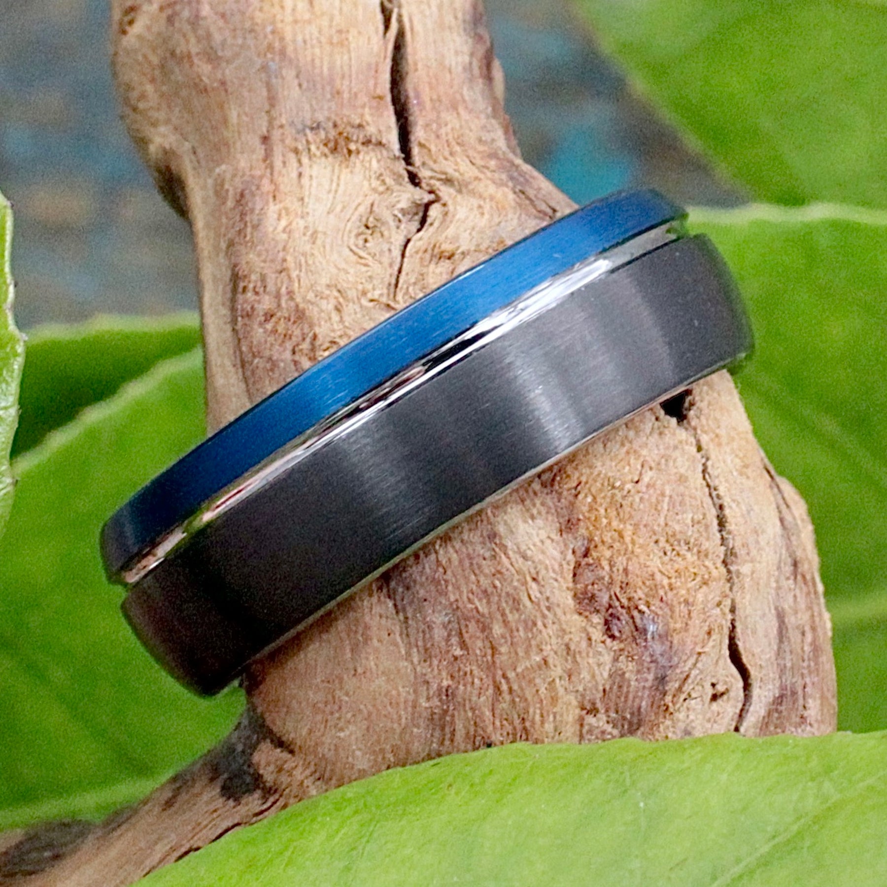 Unveil elegance with this Men's Tungsten Band Ring with Black and Blue Brushed Design. Merging style with durability, its sleek finish adds a contemporary edge to every outfit. Elevate your look with this modern masterpiece, exuding sophistication with every wear.