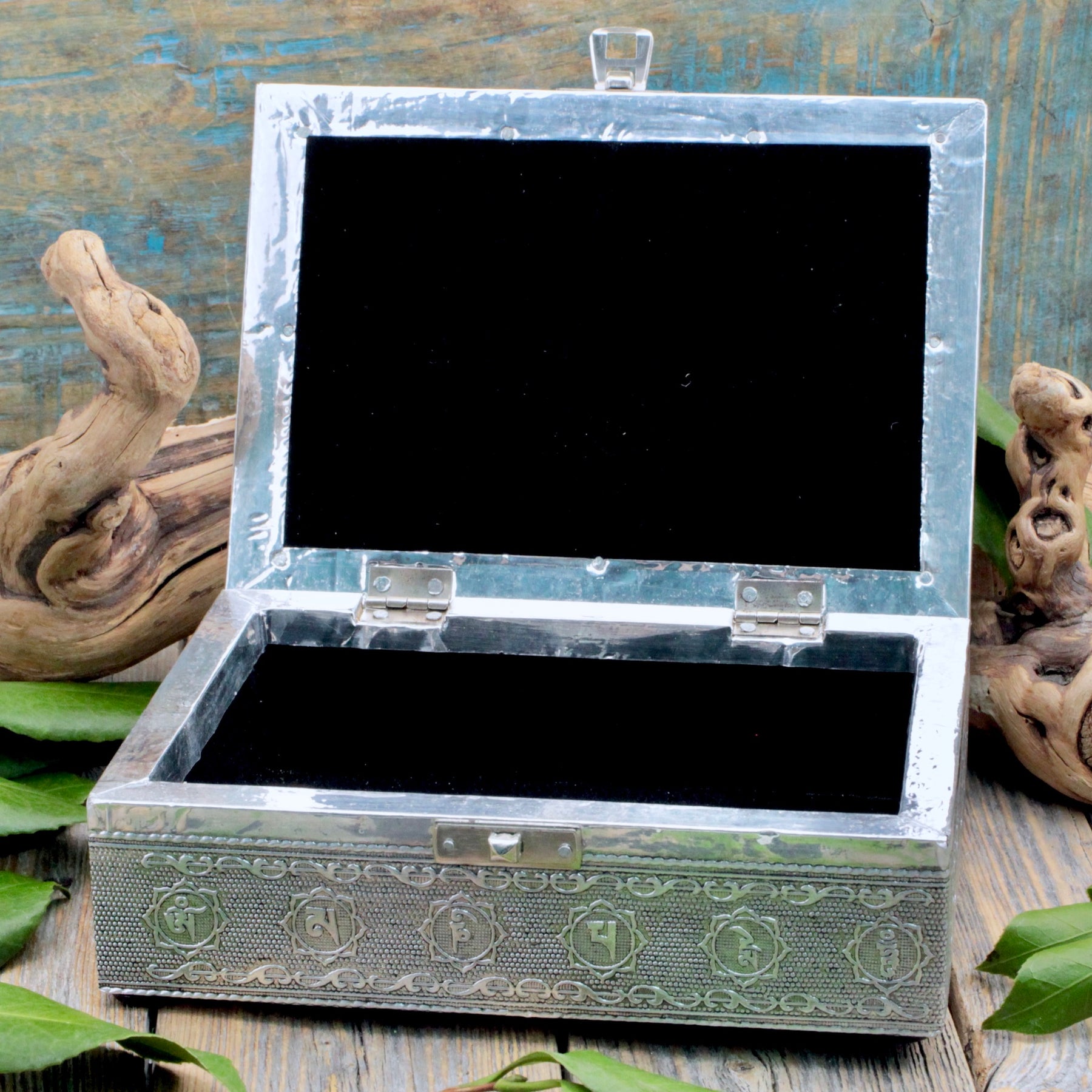Bring harmony into your space with this Silver Buddha Treasure Box. With intricately embossed designs over its entire surface, this treasure box is wonderful to keep all kinds of items that are important to you in. Its soft lining is great for fragile items and is large enough for smaller Tarot and Oracle decks.