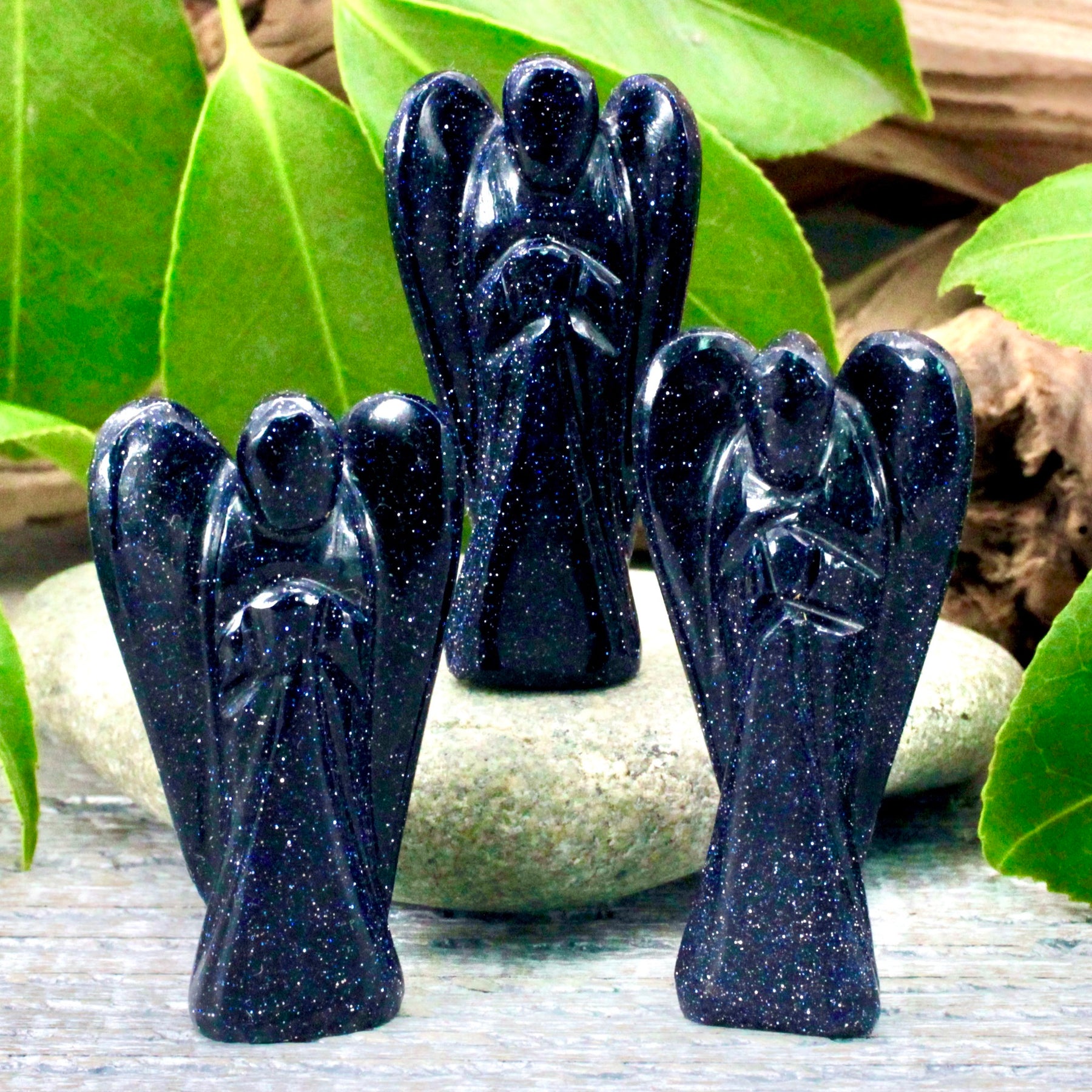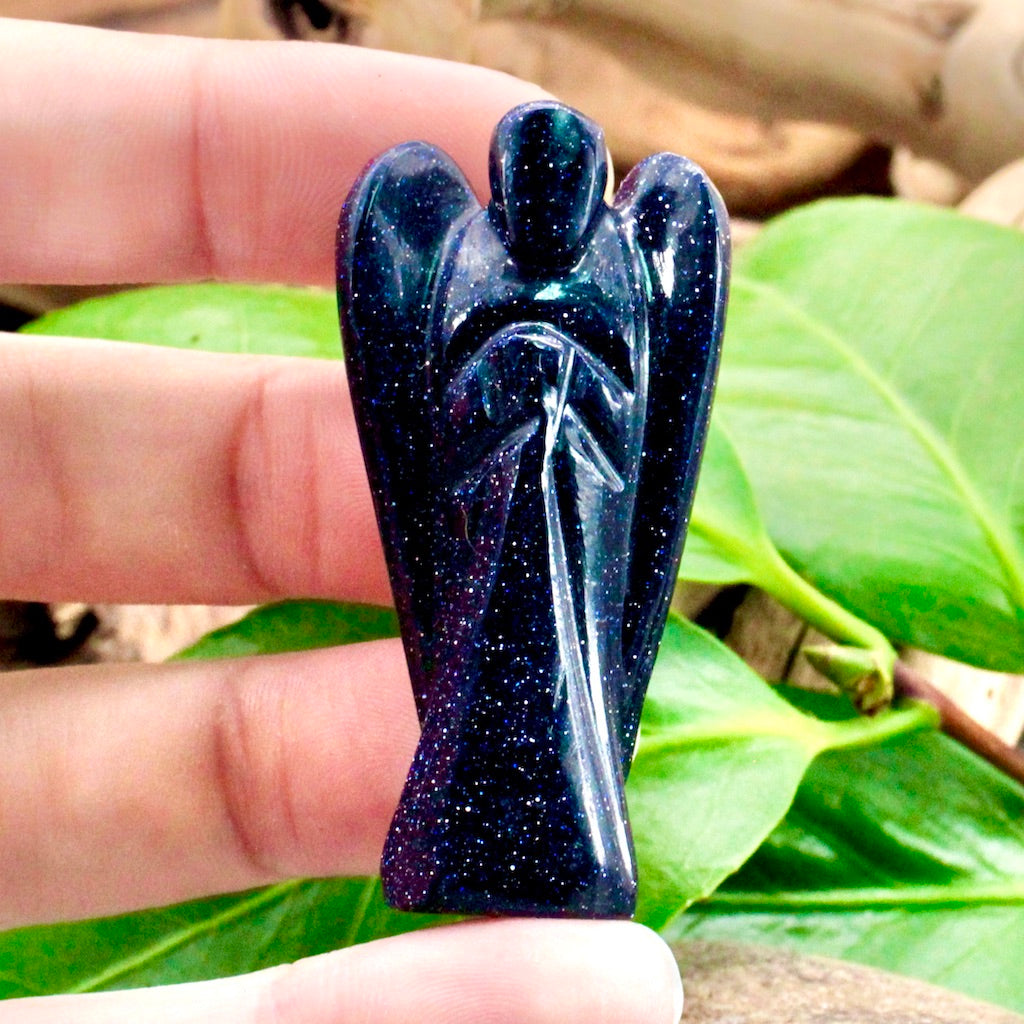 Invite new friends into your life with this Blue Goldstone angel. Blue Goldstone is a stone of human connection and a testament to the creativity that we each have in all of us.