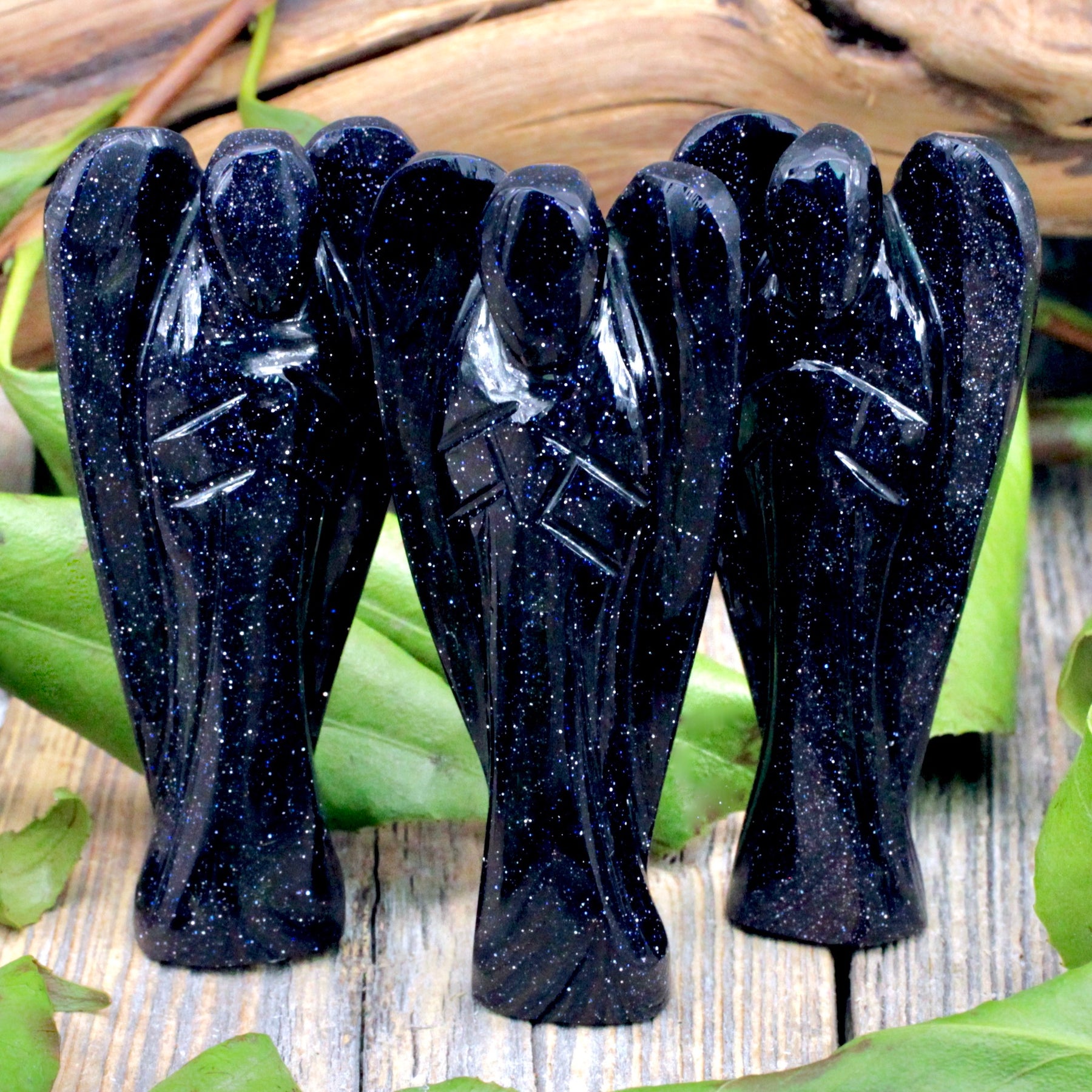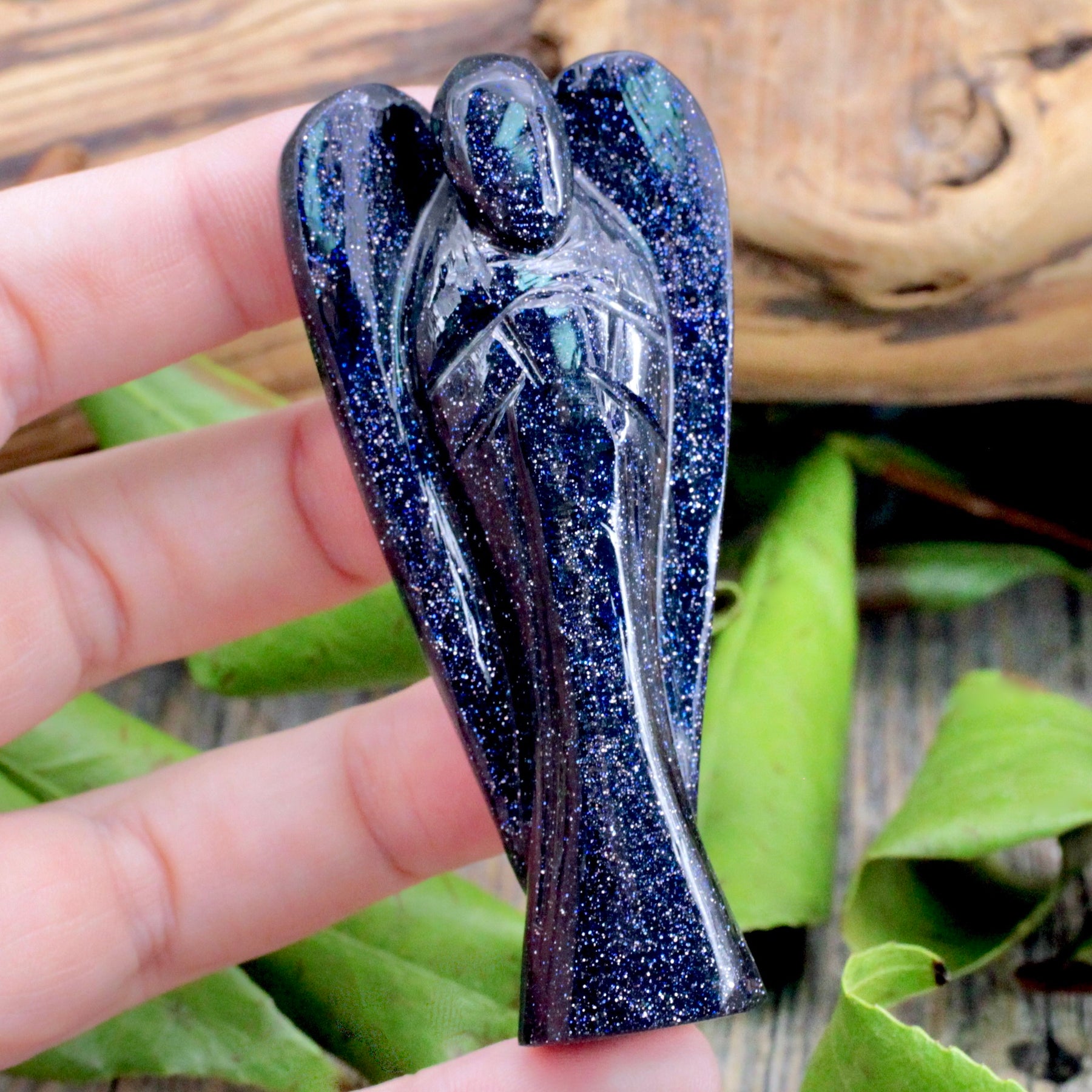 Welcome fresh connections with this Blue Goldstone Angel. Embrace bonds and ignite creativity within. Let this stone celebrate human connection and your innate imaginative spark.