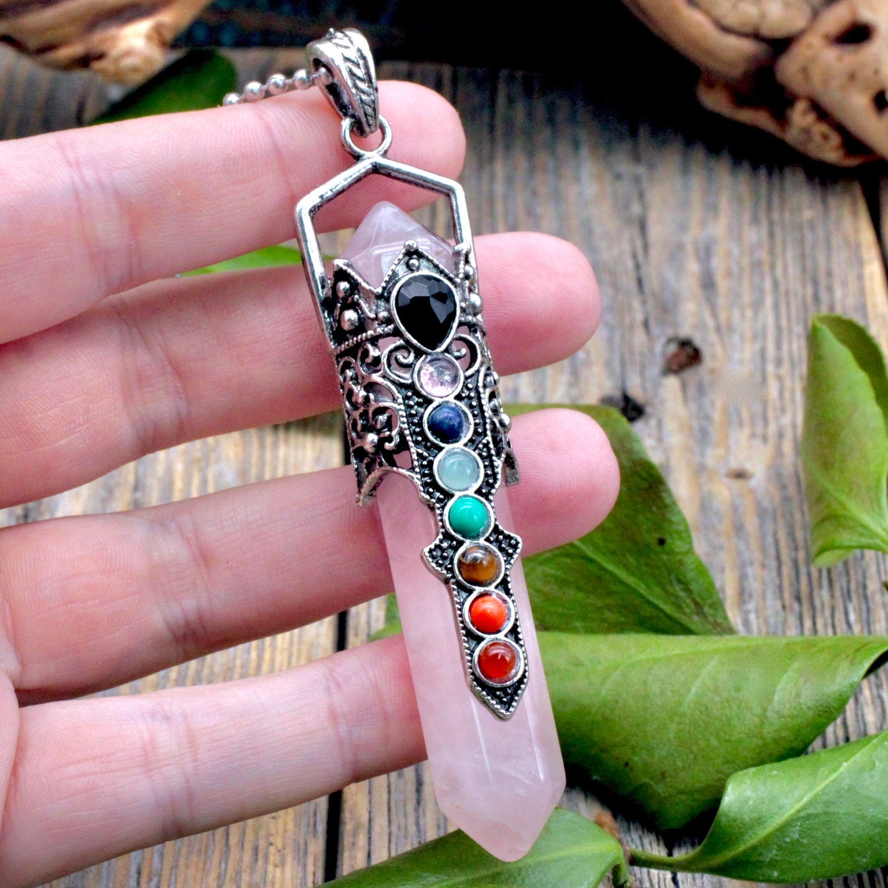 As soon as I saw this I was so drawn to it. It matches the quartz chakra wand I also have from rock mama, and it gives the same loving, healing energy. The ball chain is very long but can be easily cut and adjusted.