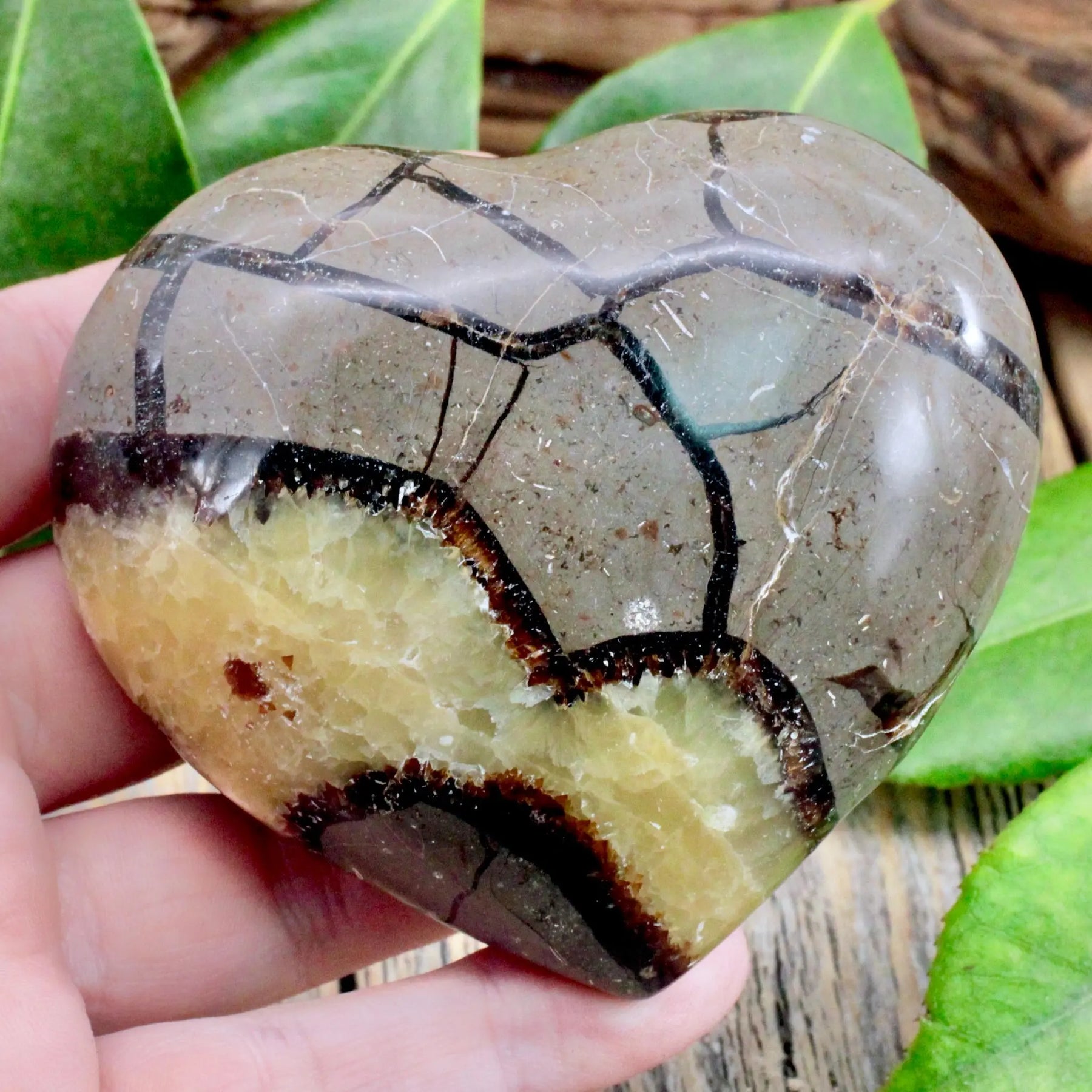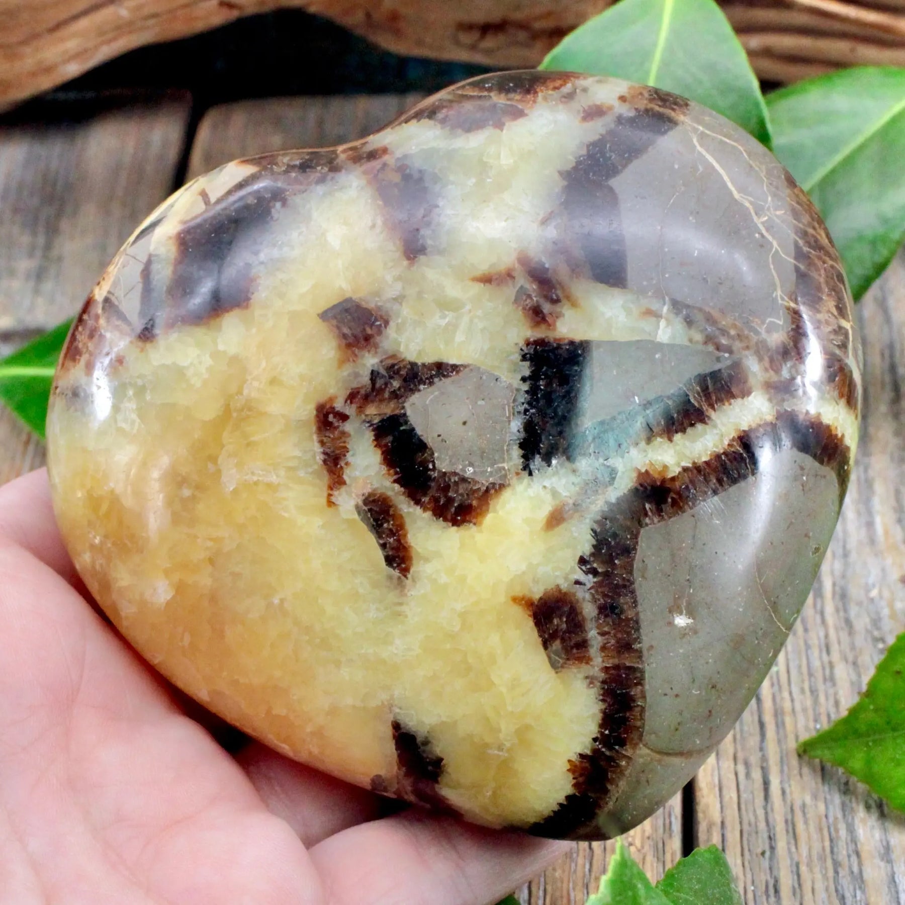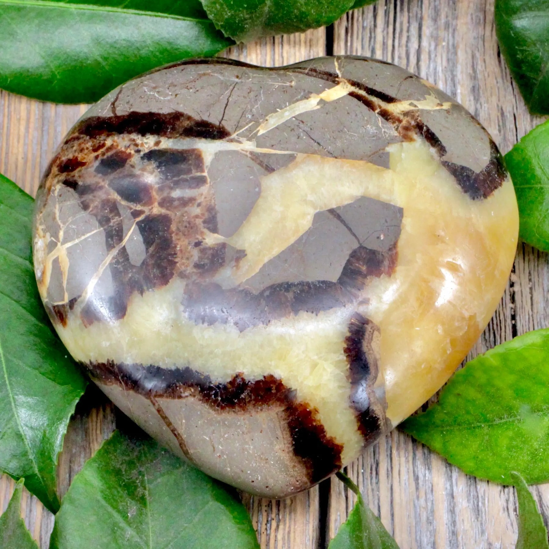 Infuse your home with positivity and joy with this captivating Septarian heart. Its buttery rich yellows create a perfect backdrop for the striking darker shades within this stone. Additionally, experience the enchantment as certain parts of the Septarian Heart glow under UV light.