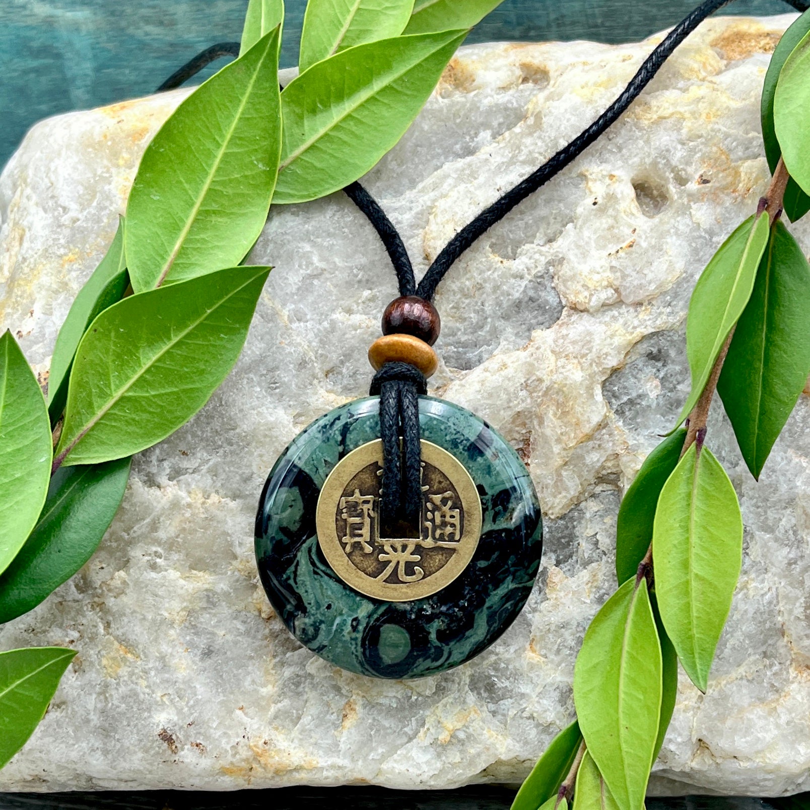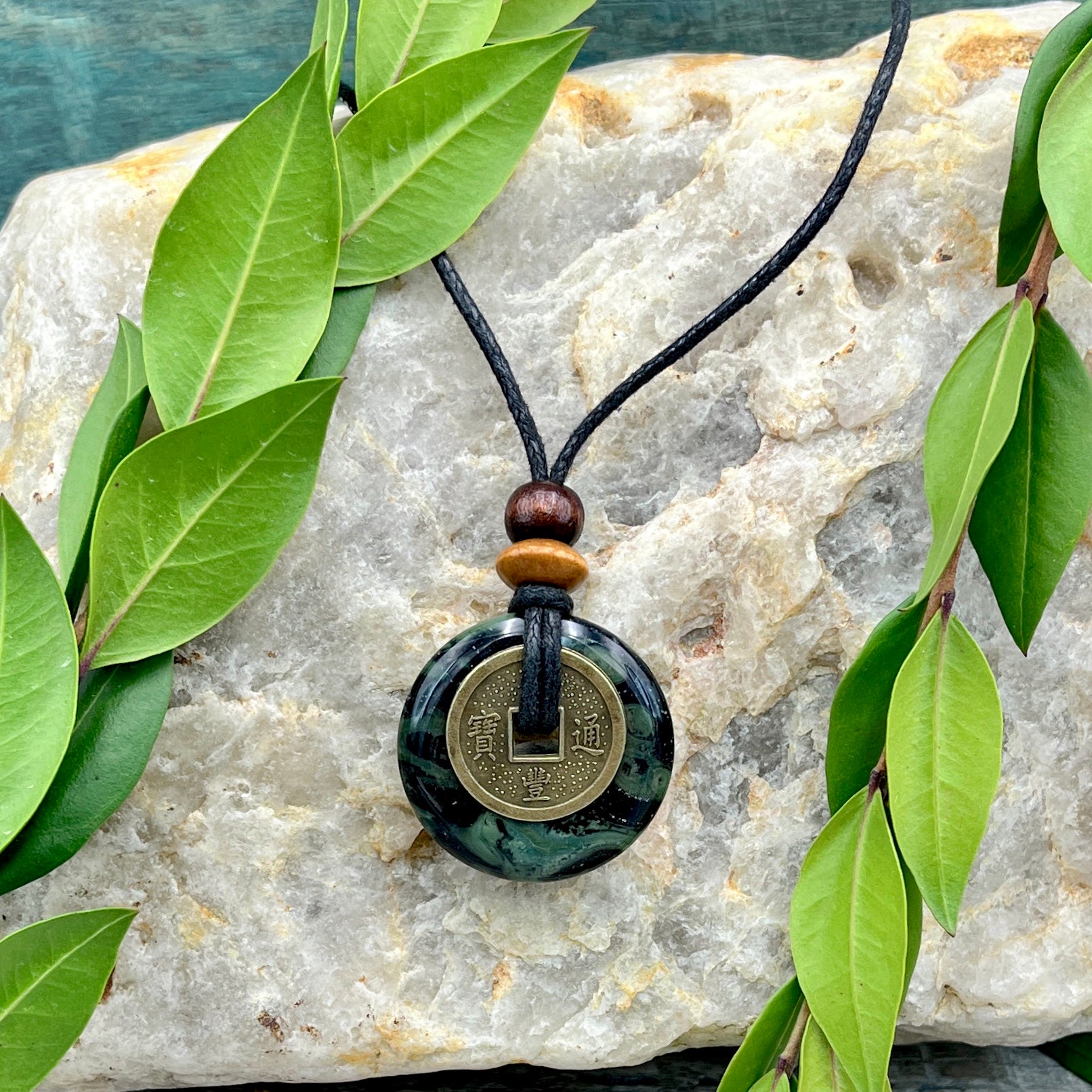 Chase away negativity with this Positive Change Kambaba Jasper Necklace. As part of our Sacred Earth Amulet collection, this piece combines the energy of the stone with the symbolism of the Chinese "I Ching" coin which brings in wealth, good luck, and protection.