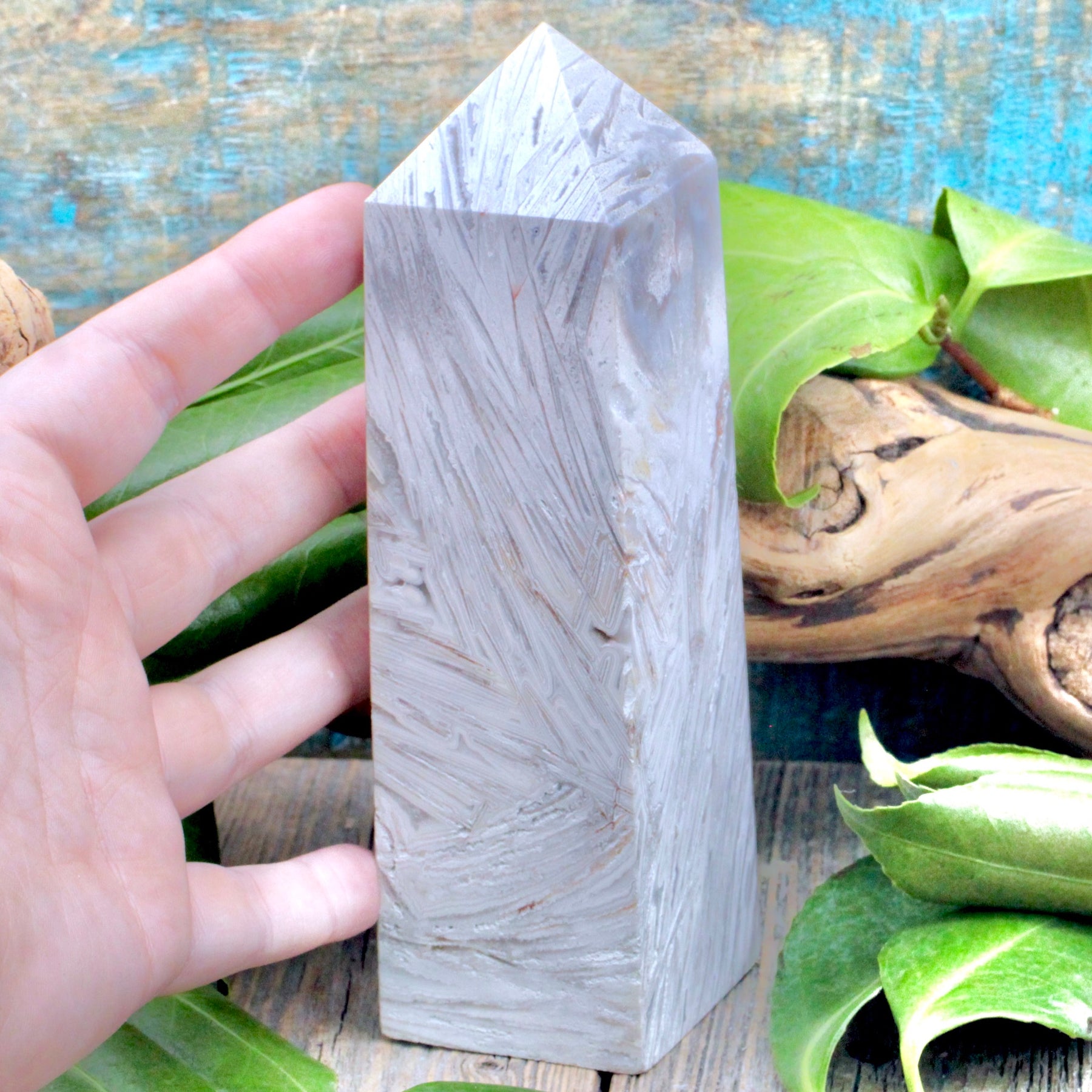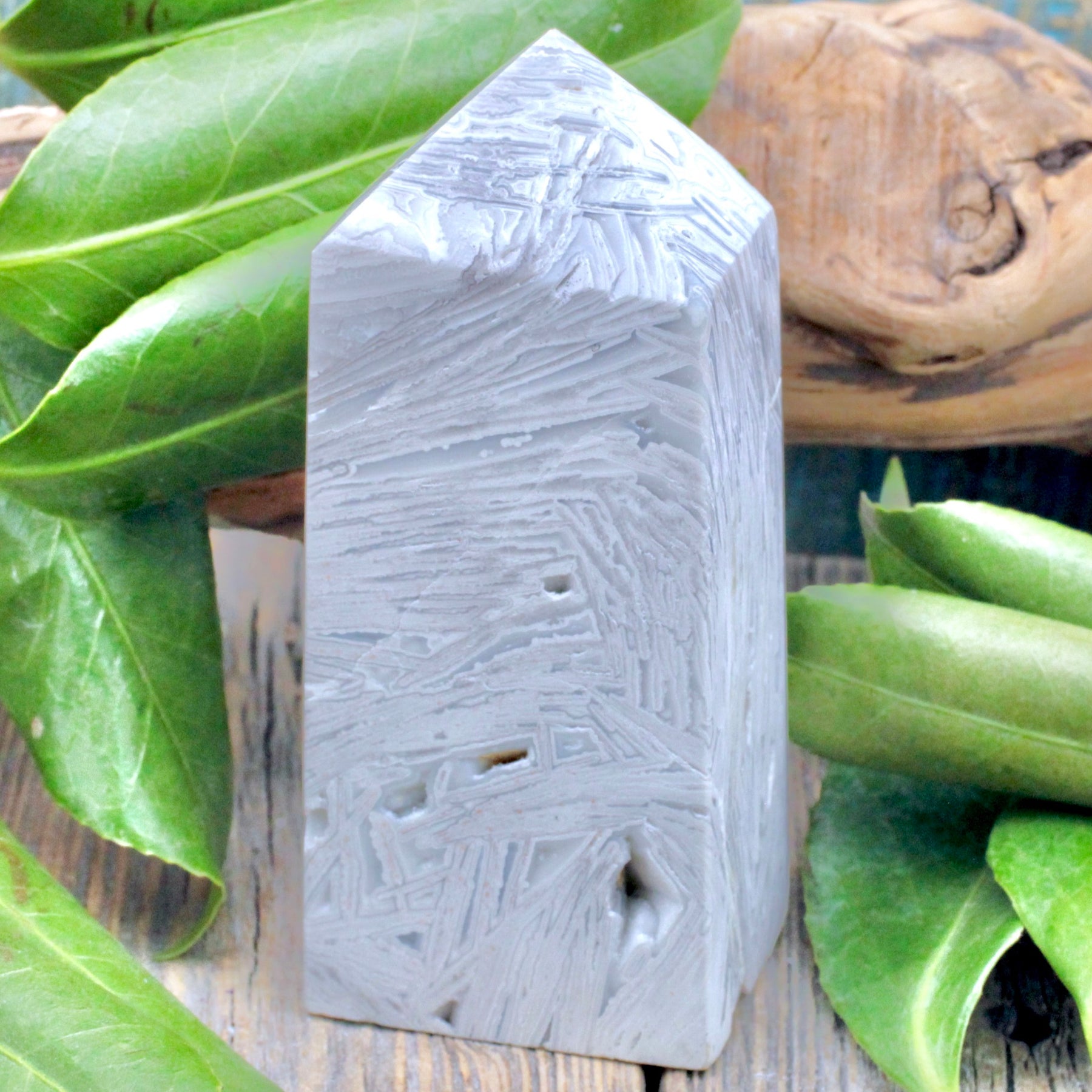 Cultivate a harmonized sense of self with this Snow Agate Obelisk, also recognized as White Agate. This exquisite Snow Agate obelisk captivates the observer with its intricate patterns of white and grey stripes. Much like the intricate energies interconnecting us in the universe, the energy of this stone serves as a reminder of these cosmic ties.