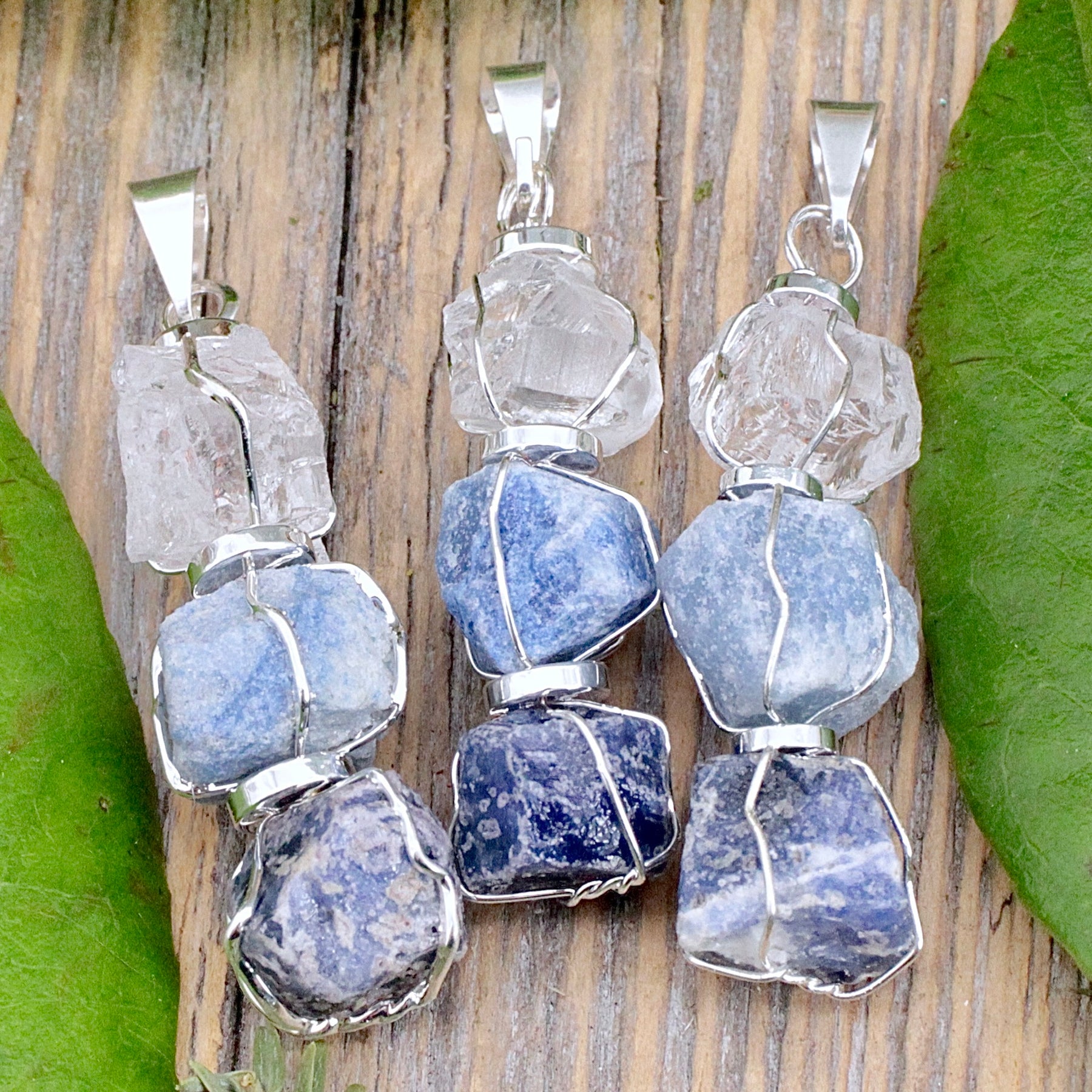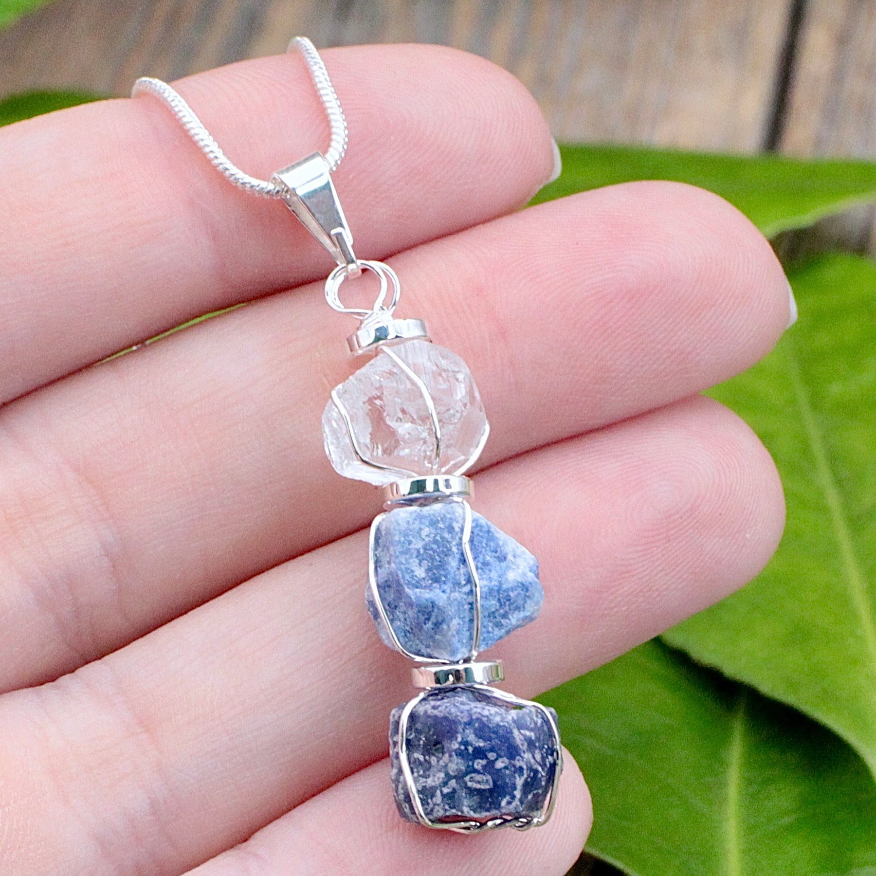 Unlock your intuition with this Third Eye Chakra Three Stone Pendant. Featuring Clear Quartz, Blue Quartz, and Sodalite, it enhances insight and perception. Embrace clarity and intuition with this powerful combination of stones.
