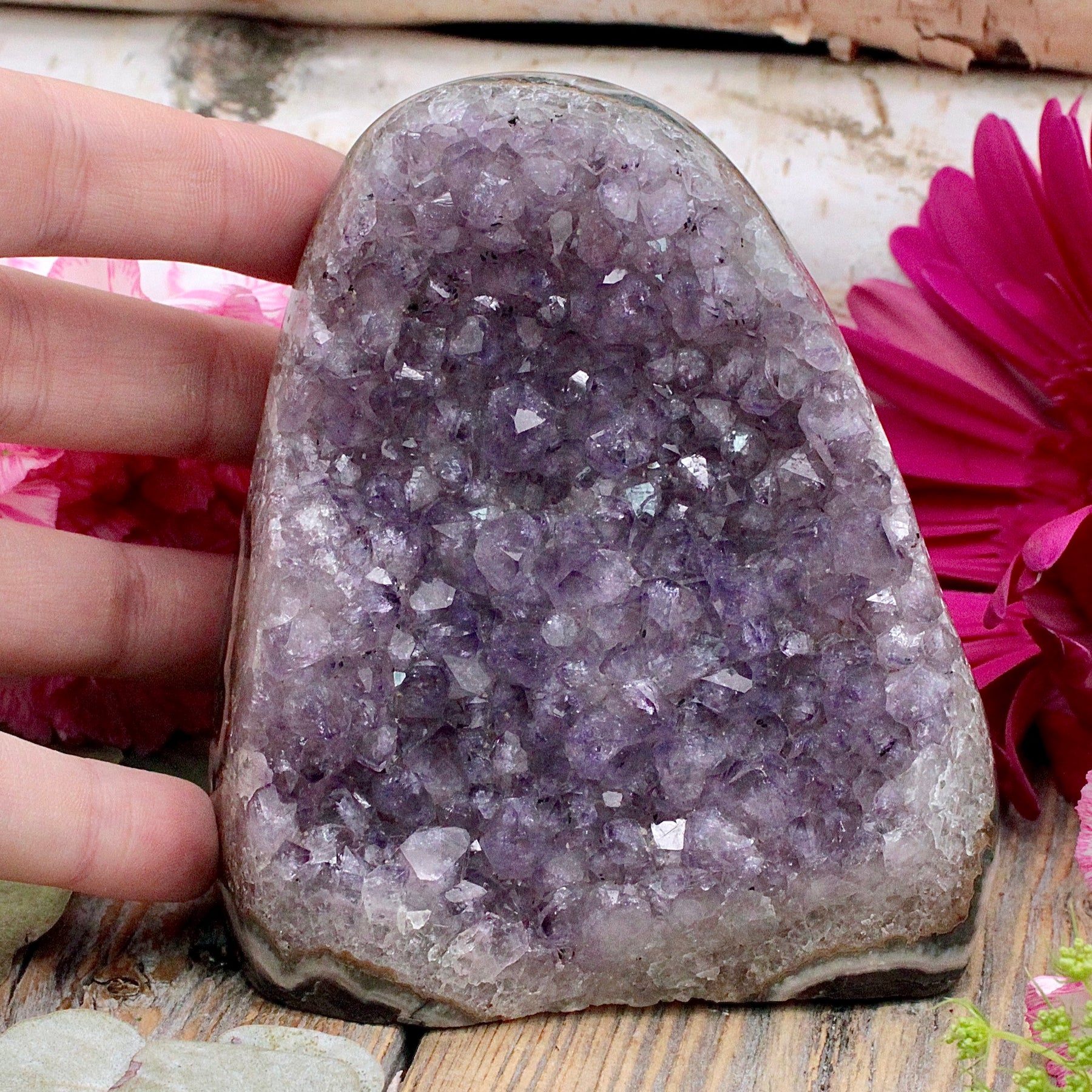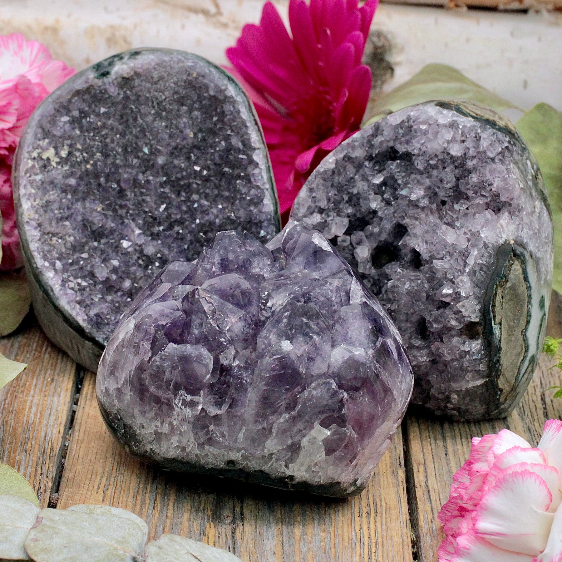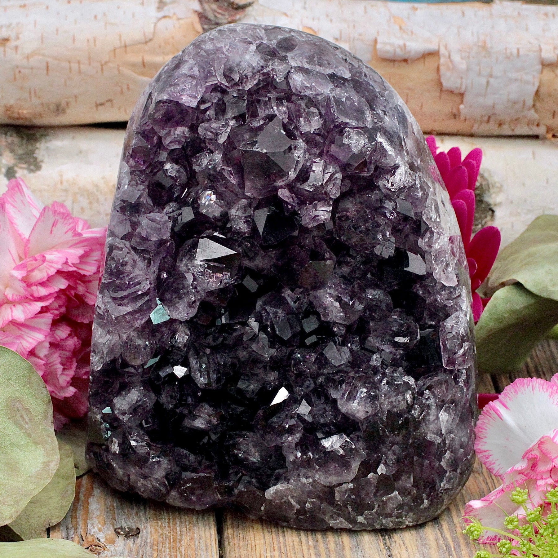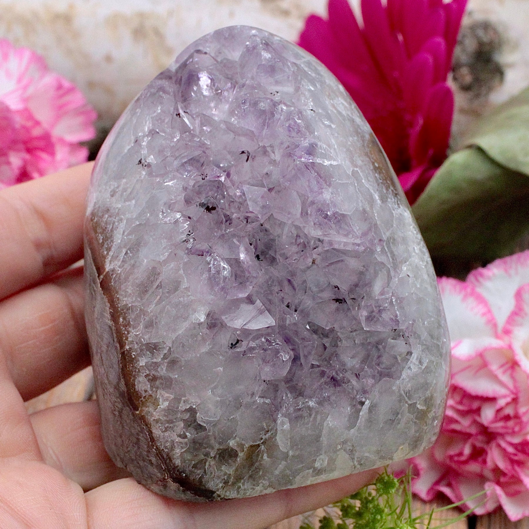 Amethyst is a protective stone that transforms negative energy into love, enhances intuition and aids connection to the Divine. It increases peace and serenity and heightens meditation and prayer. This stone promotes love, psychic gifts, and intuitive dreams. Amethyst assists in overcoming addictions and making wise decisions.